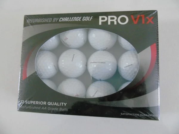 A box containing one dozen grade AA Titleist Pro V1 golf balls. These balls are professionally refurbished by Challenge Golf of the USA.