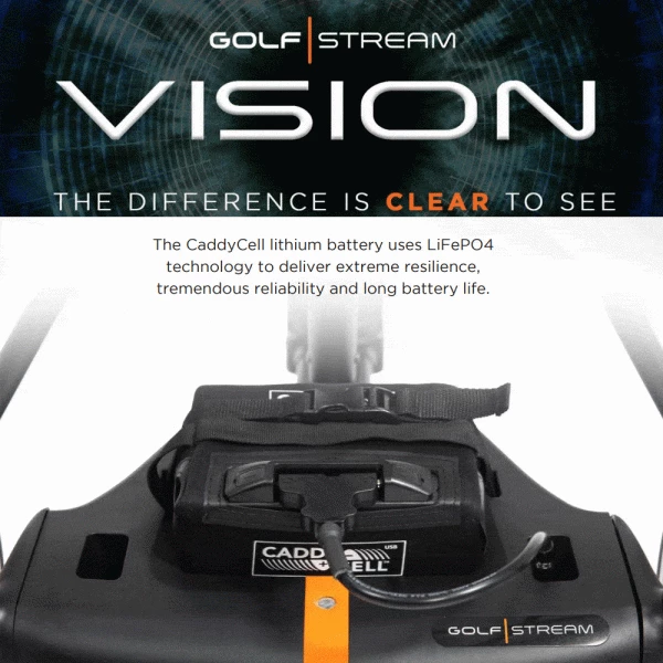 The New & Improved features Revolutionary Caddy White screen technology that can be seen easily in even the brightest of sunshine. The front wheels feature housing to avoid clogging and this Golf trolley also has Super slick high grip PU rubber tyres that are durable and built to last. Your bag is held beautifully by two side arms without “perching” on the central beam to avoid bag wobble and the Vision Electric Golf Trolley folds flatter than most trolleys via a one touch super simple fold/unfold system. Golfstream’s Vision Trolley even lets you personalise the main screen to allow names and there is a simplicity mode for those who don’t want the fancy extras when using this golf trolley. The Trolley is powered by a Caddy Cell Lithium battery which is Super quiet yet powerful for an uninterrupted round.